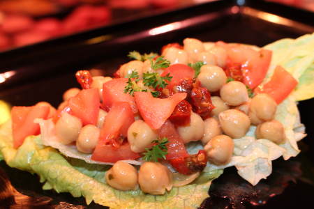 Kichererbsensalat, mit frischen Tomaten, getroknete Kräuter Tomaten, Paprika, Lauchzwiebel und mit Koriander in einem schmackhaften Balsamicodressing
