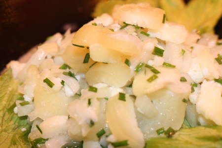 Handkäs‘ -Salat Zutaten: Handkäse, Zwiebeln, Rettich, Schnittlauch in einem deftigen Essig-Öl-Dressing.