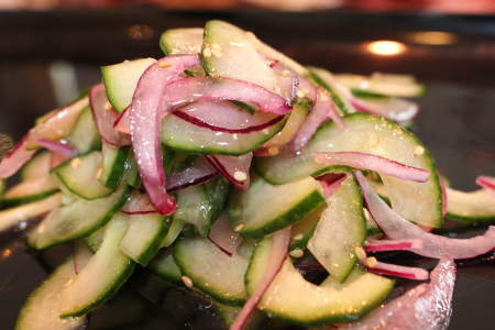 Gurkensalat Zutaten: Salatgurken, rote Zwiebel, frischer Ingwer, Koriandergrün frisch, Knoblauch, Sesam, Sesamöl, Pfeffer und Salz Wir empfehlen: Optimal für Ihre Grillplatte und allem kurz Gebratenem