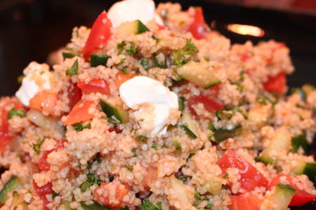 Feiner Bulgursalat Zutaten: Feiner Bulgur, Tomaten, Gurken, Schafskäse, Petersilie, abgeschmeckt mit einem feinen Balsamico-Dressing.