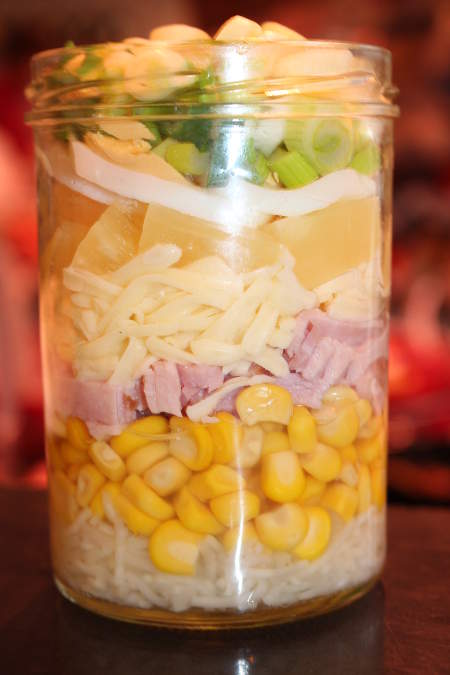 Schichtsalat Zutaten; Salat, Mais, Eier, Kochschinken, Gouda, Lauch, Sellerie , Ananas, angemacht mit einem leichten Joghurtdressing. Dazu empfehlen wir Ihnen: Hähnchen oder Putensteak