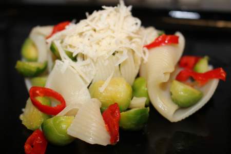 Rosenkohlsalat in Zitronendressing, mit Muschelnudeln und ein wenig Schärfe durch rote Peperoni und rote Pfefferbeeren. Wir empfehlen: Steak vom Rind oder vom Kalb schön gebraten nur mit Salz, Pfeffer und etwas Rosmarin gewürzt.