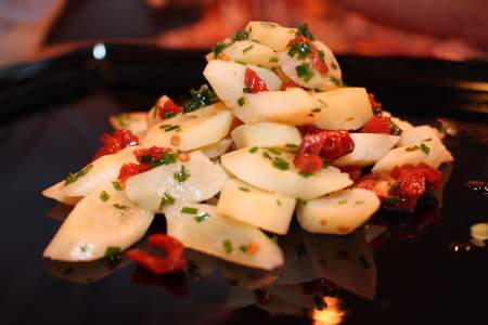 Schwarzwurzel- Salat mit getrockneten Tomaten in einem traumhaften Senf- Zitronen- Dressing. Wir empfehlen: Natürlich ein deftiges Stück Rind,Schwein als Steak geschnitten. Keine Geflügel oder Kalb, der Fleischgeschmack würde bei solch deftigem Salat unter gehen.