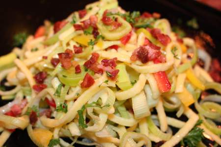 Spätzlesalat: mit Lauch, Paprika und Schinkenwürfeln in einem Senf- Dressing.