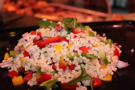 Perlgraupensalat mit Paprika, roten Zwiebel, Tomaten, Ruccola, Gurken lecker abgeschmekt in einem deftigen Dressing mit Macis und Piment.
