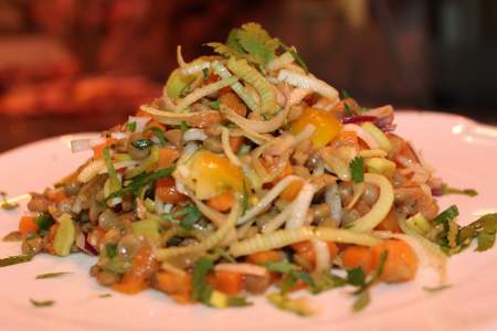 Linsen Salat ( Achtung schon wieder Vegetarisch) mit Tomaten, Zwiebel, Karotte, Lauch und Gurke fein abgeschmeckt mit etwas Ingwer und Koriander. Wir empfehlen: Ein schönes Steak vom Kalb.