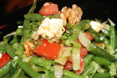 Grüne- Bohnen- Salat Zutaten: Bohnen,Tomaten,Lauch,Rucola,Walnüsse, Kräuter, in einem Balsamico- Honig-Dressing. Wir empfehlen: Jede Sorte Fleisch, natur gebraten mit Pfeffer und Salz.