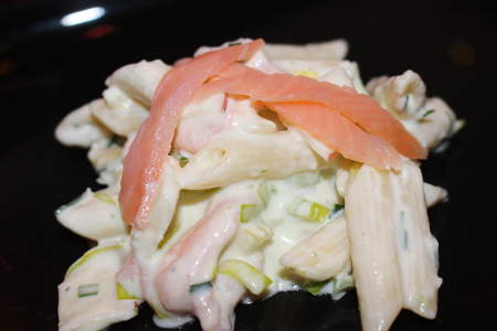 Nudelsalat mit Räucherlachs Zutaten: Nudeln, Räucherlachs, Lauch, Apfel, Pfeffer, Salz in einem Meerrettich- Crème- Fraîche- Dressing