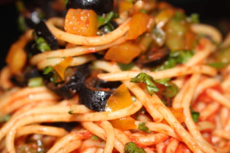 Spaghettisalat, mit getrockneten Tomaten, Oliven, Paprika, Rucola in einem feinen Tomaten- Balsamico- Dressing