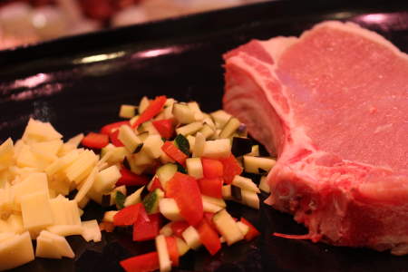 Gefüllte Schweinekoteletts Zutaten: Schweinefleisch, Aubergine, Paprika, Zwiebel,Emmentaler und Kräuter. Zubereitung: Braten Sie das Steak auf dem Herd oder dem Grill an und lassen Sie es langam weiter in einem geschlossenem Gefäß ziehen. Wir empfehlen: Servieren Sie das Steak zum Grillen oder einfach mit einer Tomatensoße und Pasta. Guten Appetit!!!