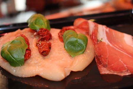 Hähnchenbrust Italia Zutaten:Hähnchenbrust, getrocknete Tomaten, Basilikum, würziger Südtiroler Bauernspeck, vollendet mit mediterranen Gewürzen. Zubereitung: Braten Sie die Hähnchenbrust in einer heißen Pfanne solange an, bis der Südtiroler Bauerspeck knusprig ist. Stellen Sie die Hähnchenbrust mit der Pfanne in den auf 140°C vorgeheizten Ofen. Bitte legen Sie dann die Hähnchenbrust nach 15 Minuten auf den Rost und schalten die Temperatur auf …