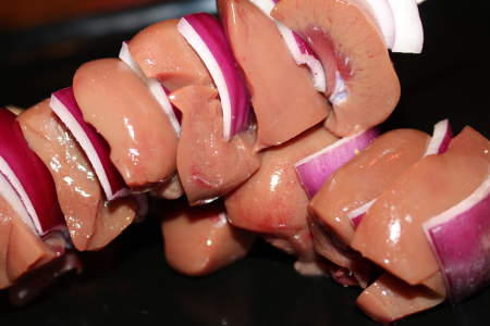 Kalbsnierenspieß Zutaten: Kalbsniere, Zwiebel. Zubereitung: Kalbsnierenspieß anbraten und in der Pfanne ca. 15 min ziehen lassen. Wir empfehlen: Zwiebeln in der Pfanne mit dem Kalbsnierenspieß anbraten und mit ein wenig Brühe aufgießen, Deckel schließen und 15 min. köcheln lassen. Gerne können wir Ihnen die Soße küchenfertig anbieten. Dazu passen hervorragend Kartoffelecken aus dem Backofen!